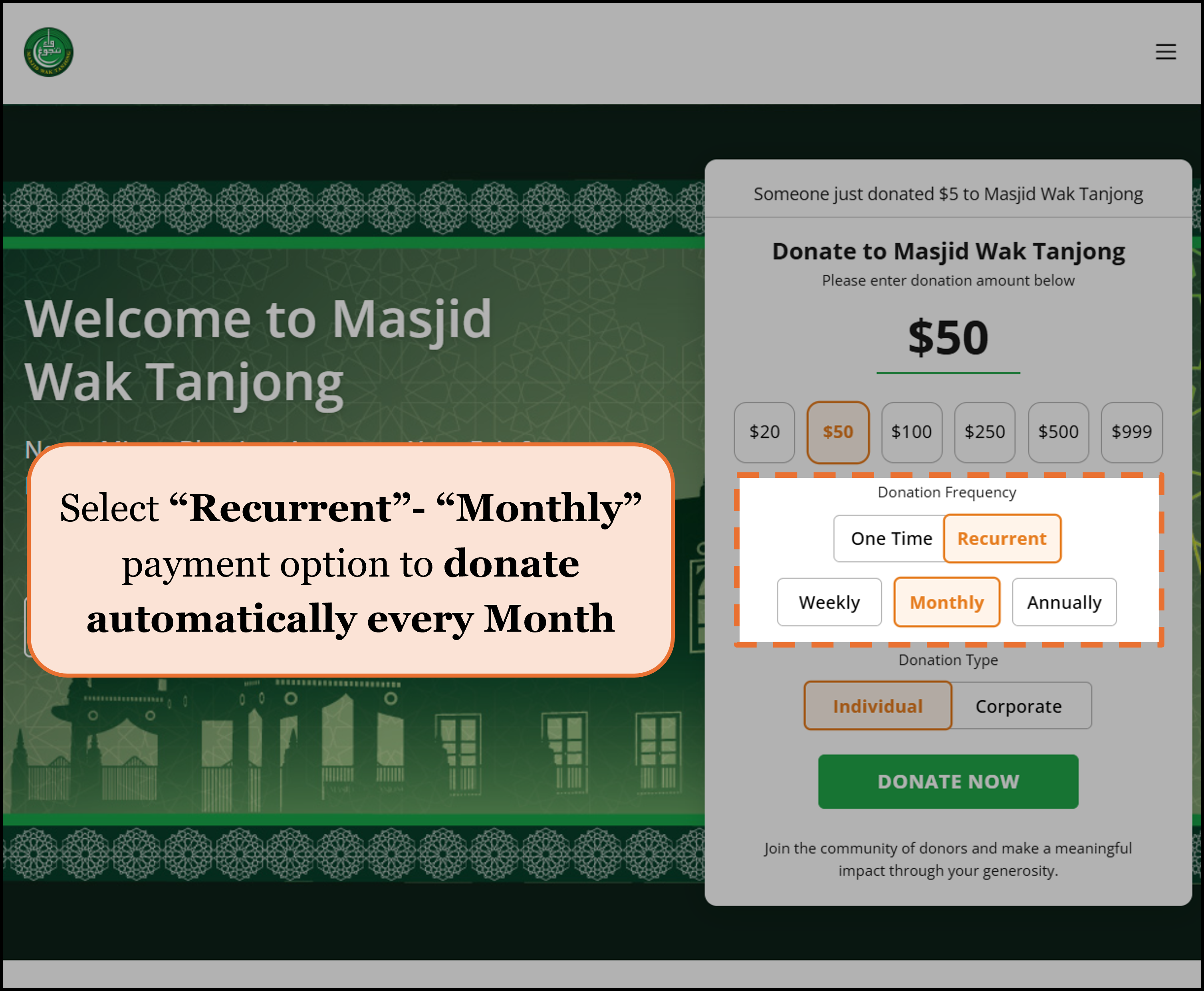 *Automated Monthly Donations are now hosted at https://www.waktanjong.org/ to ensure that more of your donation goes directly to the Masjid*